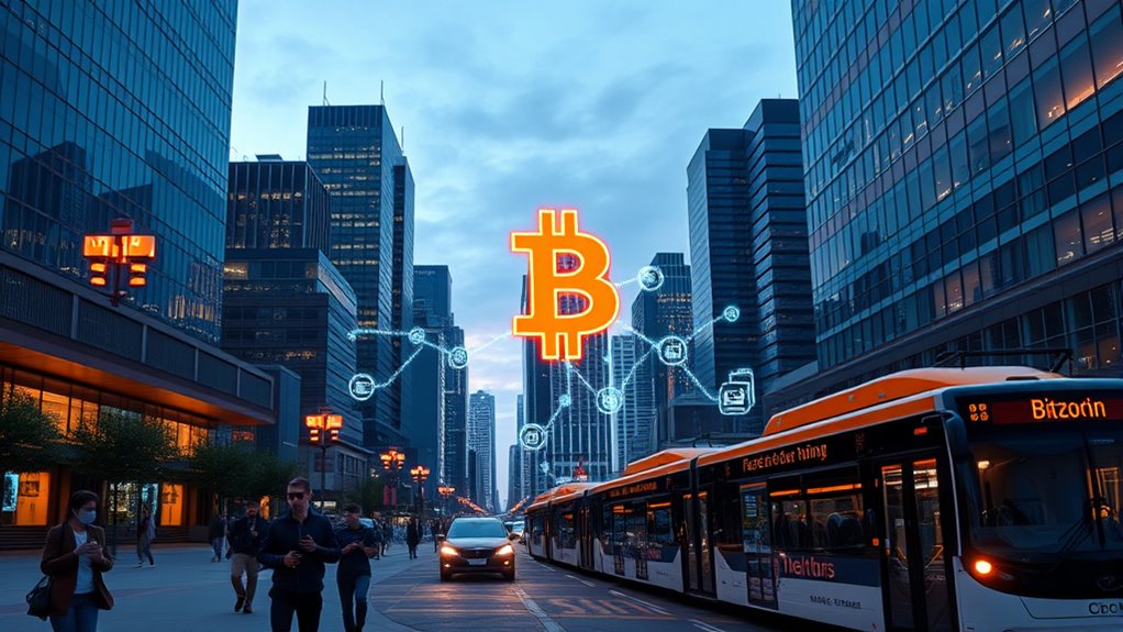 Integrating Bitcoin into smart city infrastructure can make public services, transportation, and transactions more efficient and transparent. You’ll benefit from faster payments and secure digital systems that modernize urban management. However, you should also consider challenges like regulation and high energy consumption, which impact sustainability goals. If you’re interested, there’s more to explore about how cities balance technological progress with environmental responsibility to create smarter, greener urban areas.
