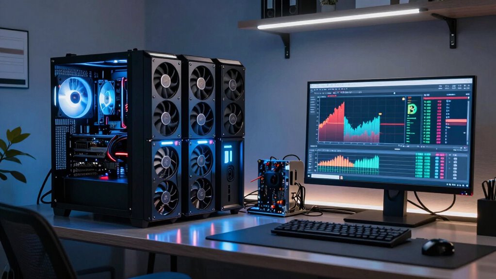 You’ll find that current costs for home mining include electricity costs, which can be significant depending on your local rates, and hardware expenses, as powerful mining equipment can be pricey upfront. While electricity costs can eat into your profits, investing in efficient hardware helps. Balancing these expenses is vital to guarantee your mining efforts remain profitable, especially as hardware prices fluctuate and energy costs vary.