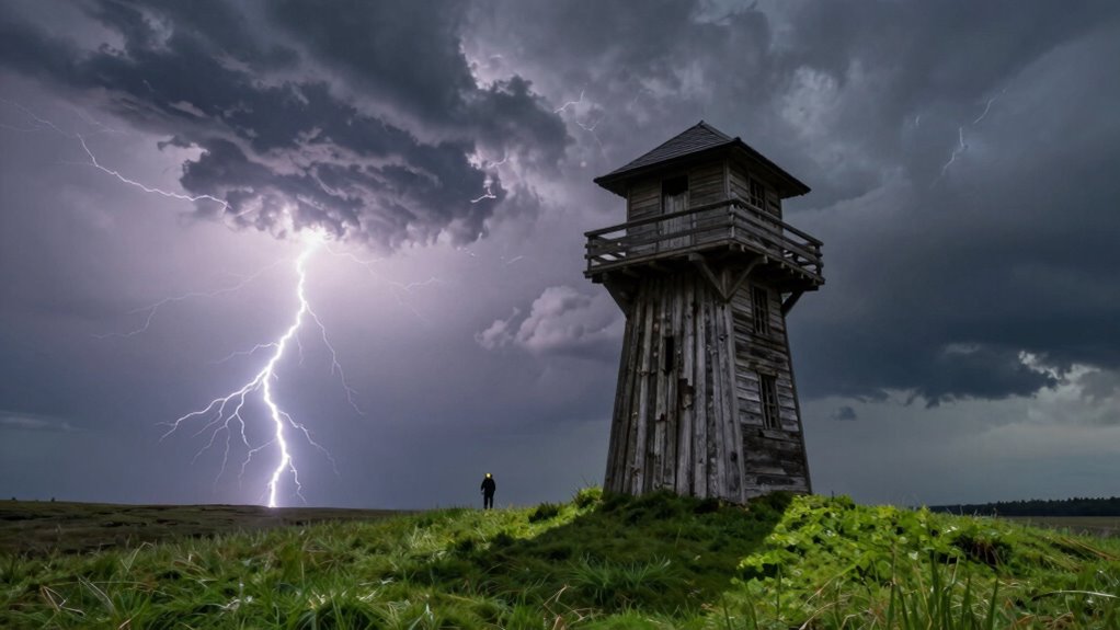 You might see watchtowers as dull structures, but they become essential when a lightning user needs help. Their durable construction withstands stormy weather, providing a safe vantage point to monitor dangerous weather and lightning activity. Modern innovations and biohacking boost their effectiveness, blending ancient resilience with new technology. When a lightning strike is imminent, these towers’ true importance proves itself. Stay with us to discover how this overlooked structure plays a key role in survival.