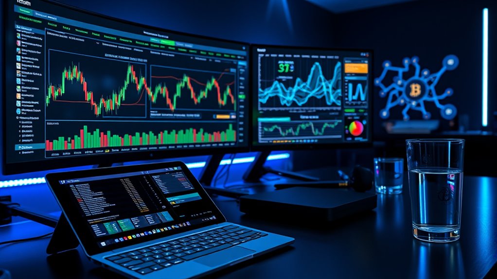 Moreover, AI’s ability to learn and adapt over time guarantees that your forecasting tools become more accurate as they process new data. Machine learning algorithms refine their predictions based on past successes and failures, making your analysis increasingly reliable. This adaptability is especially important in the cryptocurrency space, where news cycles and investor sentiment can change rapidly. Additionally, understanding the contrast ratio of projectors can be beneficial for visual displays related to market analysis, ensuring clear and vivid presentation of data visuals. By integrating AI into your trading strategy, you can stay ahead of market shifts, respond swiftly to new information, and minimize risks associated with unpredictable price swings. Overall, AI’s capacity to combine quantitative and sentiment analysis empowers you to navigate the complex Bitcoin market with greater confidence, turning data into actionable insights that improve your trading outcomes.