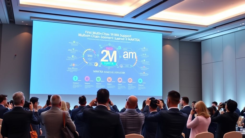 MANTRA has launched the world’s first MultiVM blockchain that supports real-world asset (RWA) tokenization. This innovative platform combines the strengths of both Ethereum’s EVM and CosmWasm smart contract ecosystems, making it easier to develop and deploy decentralized applications. It offers built-in compliance features through Dubai’s VARA license, ensuring secure, transparent transactions. If you keep exploring, you’ll discover how this breakthrough can reshape asset management and blockchain interoperability.