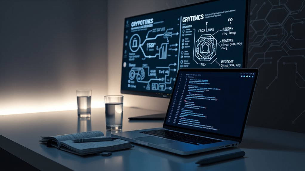 You’re exploring future research directions in cryptography without trusted setup. Focus on developing more efficient, scalable zero-knowledge proofs like STARKs that enhance privacy and security. Investigate post-quantum resistant protocols and hybrid schemes for long-term safety. Work on secure multiparty computation methods that eliminate trusted third parties, reducing overhead. Address implementation challenges, especially for resource-constrained devices, ensuring these advanced cryptographic schemes are practical, accessible, and ready for widespread adoption.