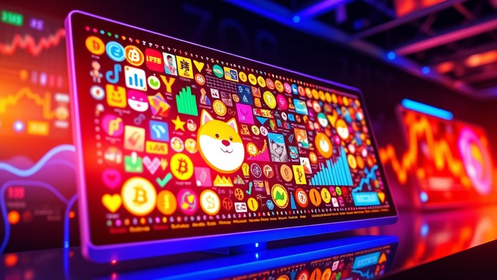Meme coins like Dogecoin and Shiba Inu have redefined market narratives by transforming internet jokes into influential financial assets through strong community support, viral trends, and strategic NFT collaborations. They leverage storytelling, culture, and digital camaraderie to turn playful tokens into symbols of innovation and investment. Blockchain technology adds transparency and trust, fueling their growth. To discover how these digital trends reshaped the landscape, keep exploring this fascinating evolution.