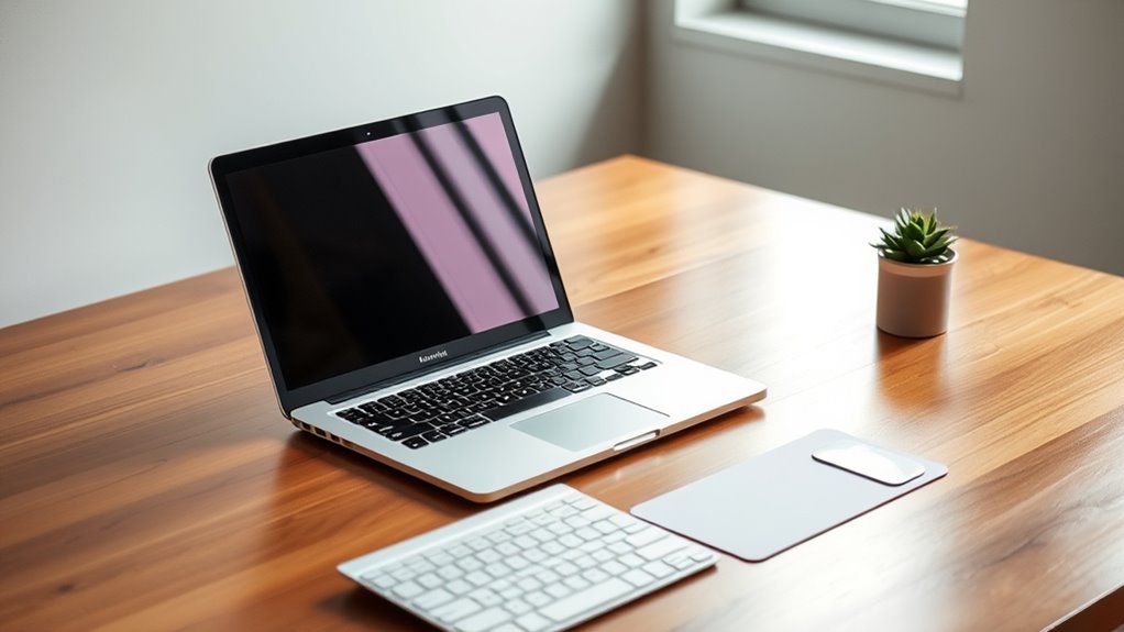 Security and privacy features are vital considerations when selecting a 15-inch MacBook Air, especially given the increasing importance of data protection in today’s digital world. Apple integrates advanced protections that keep your data safe from external threats and unauthorized access. Features like Touch ID add biometric security, making it easy to access your device and authorize transactions securely. The latest models include hardware-based security elements embedded within the M4 chip, defending against firmware and software vulnerabilities. Apple’s privacy-focused approach guarantees external access to sensitive information is minimized, supporting on-device processing and encryption. Built-in tools, such as app permissions and data transparency controls, give you control over how your data is accessed and shared, making privacy an integral part of your overall device security.