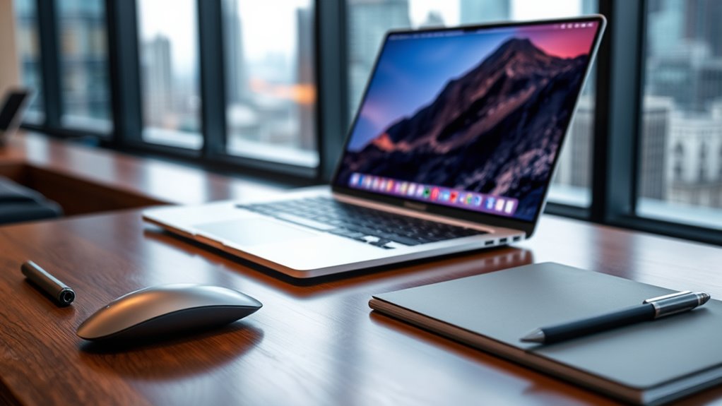 To get the most out of a 2TB MacBook Air, I need to pay close attention to its performance specifications, which are vital for handling large files and demanding applications. A powerful processor like the M4 chip is essential, as it offers a balanced combination of CPU, GPU, and Neural Engine to boost overall performance. Sufficient RAM—ideally 16GB or more—ensures smooth multitasking and data processing. Hardware-accelerated media engines in the M4 chip considerably improve large file transfers, video editing, and high-resolution media playback. Additionally, the integration of high memory bandwidth and optimized thermal management prevents overheating during intensive tasks. Collectively, these specifications determine how effectively the MacBook Air can handle power-user workloads without sacrificing speed or stability.