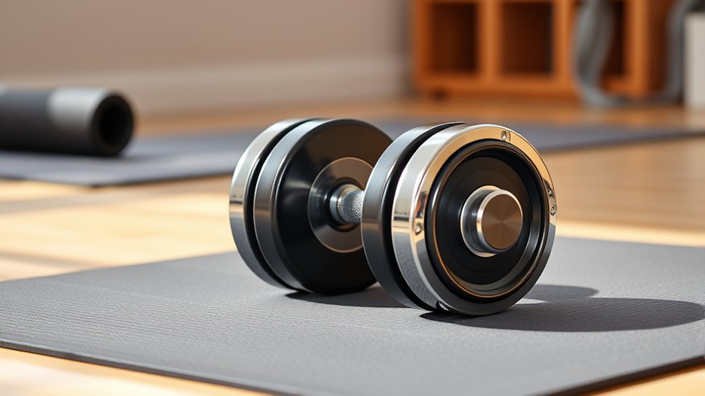 Since versatility is key in maximizing your workout space, an adjustable dumbbell set should provide a wide range of weight options to suit different exercises and fitness levels. Quick weight changes allow me to seamlessly switch between strength training, cardio, or rehab routines without wasting time. Some sets even include multiple exercise modes, like kettlebell, barbell, or push-up stand conversions, expanding my workout variety. Efficient mechanisms such as twist locks, dial systems, or quick-release handles make adjustments smooth and hassle-free, especially during circuit training. Ergonomic handles and secure locks ensure safety and comfort across all exercise types. This adaptability means I can tailor my workouts, improve overall strength, and stay motivated—all while saving space and investment.