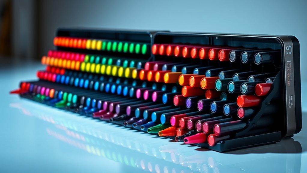 A wide and varied color range is essential for alcohol-based marker sets because it enables artists to craft more realistic and vibrant artwork. With a broad spectrum of hues and shades, I can blend seamlessly and create subtle tonal variations that bring depth to my work. Sets with 80 or more colors offer greater flexibility for shading and highlighting, making my illustrations more dynamic. Having multiple shades within each color family, like various blues and reds, helps me add dimension and realism. However, I pay attention to color consistency, ensuring the cap colors match the ink shades for accurate selection. Ultimately, a diverse palette supports my creativity across different styles, from detailed illustrations to bold graphic designs.