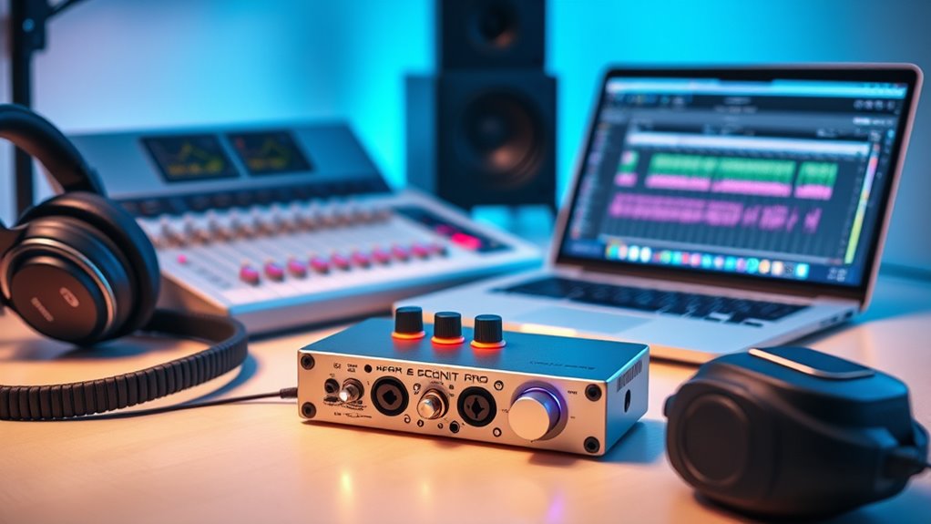 Choosing the right audio interface under $200 means balancing quality, features, and your specific needs. Whether you’re recording, streaming, or gaming, these options deliver professional sound without breaking the bank. Focus on what matters most—connectivity, sound clarity, and ease of use—to guarantee your setup sounds as good as it looks. With these choices, you can elevate your audio experience, improve your projects, and stay within budget—all with confidence.