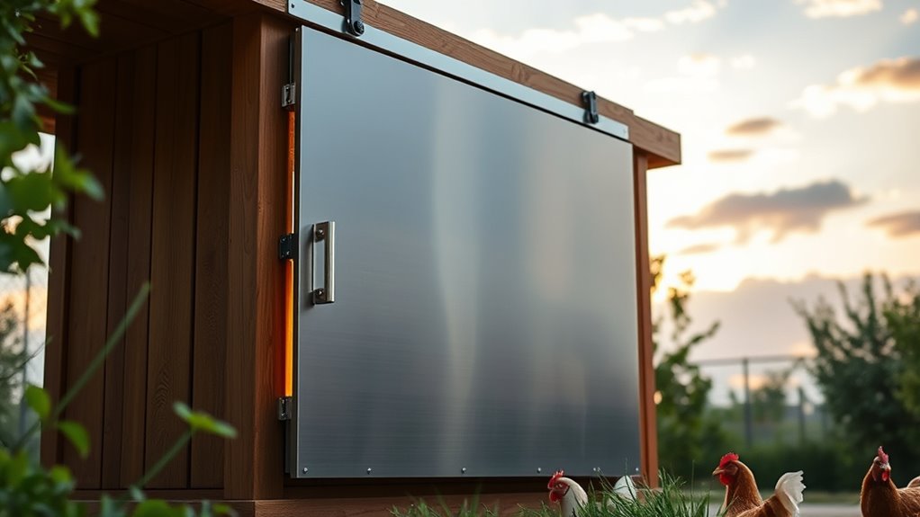 I’d say these doors have your back when it comes to predators. They often feature sturdy, lockable latches and heavy-duty materials that keep unwanted guests out. Some even include sensors that detect motion or close automatically at night, sealing the coop tighter than a drum. These security features give me peace of mind, knowing my chickens are safe and sound, no matter what’s lurking around.