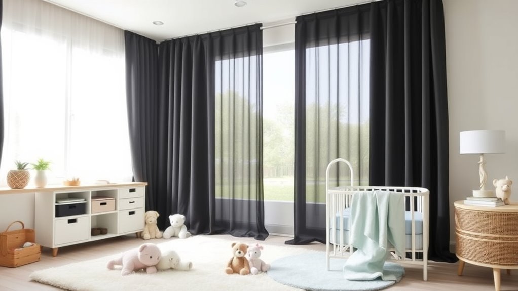 Blackout curtains markedly improve sleep quality by blocking out natural light, creating a dark environment that’s ideal for naps and nighttime sleep. I’ve found that they help my little one fall asleep faster and stay asleep longer, even during bright mornings. Plus, they reduce noise and temperature fluctuations, making the nursery more comfortable. If you’re aiming for peaceful, uninterrupted sleep, blackout curtains are a game-changer for your child’s nursery.