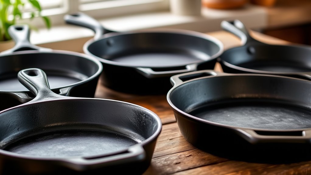 Choosing a cast-iron skillet that’s easy to maintain involves looking for features that simplify cleaning and care. I look for skillets with smooth, pre-seasoned surfaces because they’re much easier to clean than rough or uneven ones. Hand washing with minimal soap and thorough drying are essential to prevent rust and keep the seasoning intact, so I prefer skillets that respond well to simple cleaning routines. Regular re-seasoning with a light coat of oil after use helps maintain their non-stick surface and prolongs their lifespan. Proper storage is also vital—keeping the skillet dry and sometimes applying a light oil coating prevents rust and corrosion. Using dedicated cast-iron cleaning tools and avoiding soaking the skillet makes upkeep straightforward and preserves its performance over time.
