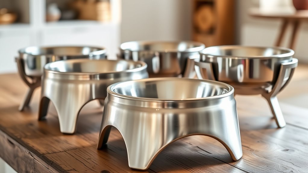 Selecting high-quality stainless steel for elevated dog bowls is essential because it guarantees durability, safety, and hygiene. Good stainless steel resists corrosion and rust, ensuring the bowl remains safe and easy to clean over time. Food-grade stainless steel meets safety standards, preventing harmful chemicals from leaching into your pet’s food. Thick, well-made bowls resist dents and scratches, making them easier to maintain and less prone to bacteria buildup. Their resistance to staining and odors keeps the bowls fresh and clean longer. Additionally, high-quality stainless steel features smooth, seamless finishes that eliminate crevices where dirt and bacteria can hide. This promotes better pet health and simplifies cleaning routines. Overall, investing in top-tier stainless steel ensures your dog’s feeding area stays safe, hygienic, and long-lasting.