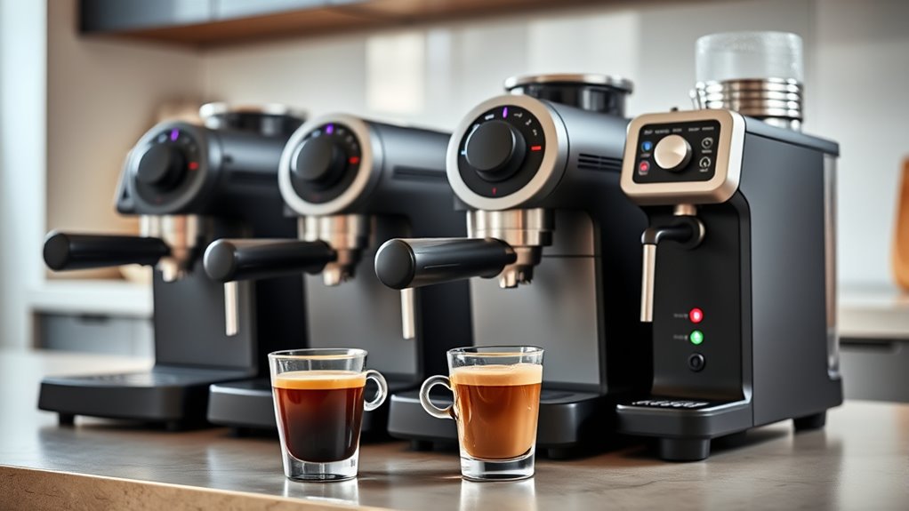Choosing an espresso machine that’s easy to operate can make a big difference, especially if you’re new to brewing or prefer a straightforward experience. Machines with intuitive controls, like simple buttons or touchscreens, help you navigate the process without confusion. Automatic features, such as programmable shot volumes or auto steam wands, reduce manual effort and make brewing quicker. Clear instructions and labeled parts simplify setup and troubleshooting, saving you time and frustration. Quick heat-up times and minimal setup steps let you enjoy your coffee faster. Design elements like ergonomic portafilter handles and accessible water tanks also boost comfort and ease during use. Overall, a user-friendly machine enhances your brewing experience, making it more enjoyable and less intimidating.