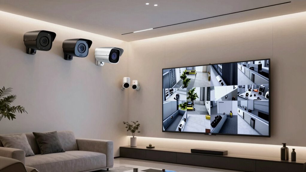 High-resolution cameras provide detailed images, but their night vision capabilities are just as important for round-the-clock security. Effective night vision relies on infrared LEDs that can illuminate areas up to at least 80 feet in darkness, guaranteeing clear images even in total darkness. Modern cameras also feature full-color night vision with smart modes that adapt to lighting conditions, producing vibrant footage in low-light settings. Multiple night vision modes, such as IR, color, and smart night vision, enhance visibility and detail in varying environments. Look for cameras with low-light performance features like starlight sensors or advanced sensor technology to assure clearer images at night. Additionally, weatherproof ratings like IP66 or IP67 guarantee reliable night vision performance outdoors, regardless of weather conditions.