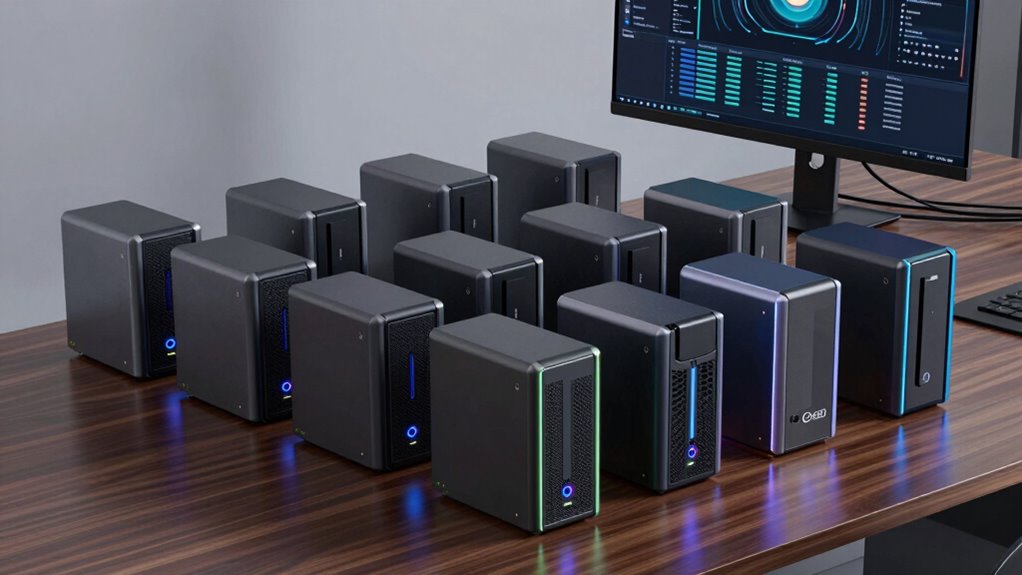 Choosing the right RAID configuration helps set a solid foundation for your NAS, but efficient cooling solutions are just as important for maintaining performance at 10GbE speeds. Advanced cooling technologies, like dual cooling systems and heat sinks, enhance airflow and minimize thermal throttling during heavy data transfers. I also recommend considering noise levels; quieter cooling solutions create a more pleasant environment in home or office settings. Active cooling mechanisms, such as large axial fans, greatly improve heat dissipation, extending the lifespan of your components. Finally, using monitoring tools for real-time temperature readings lets you manage cooling efficiency, preventing overheating during intensive tasks like 4K video processing or large file backups.