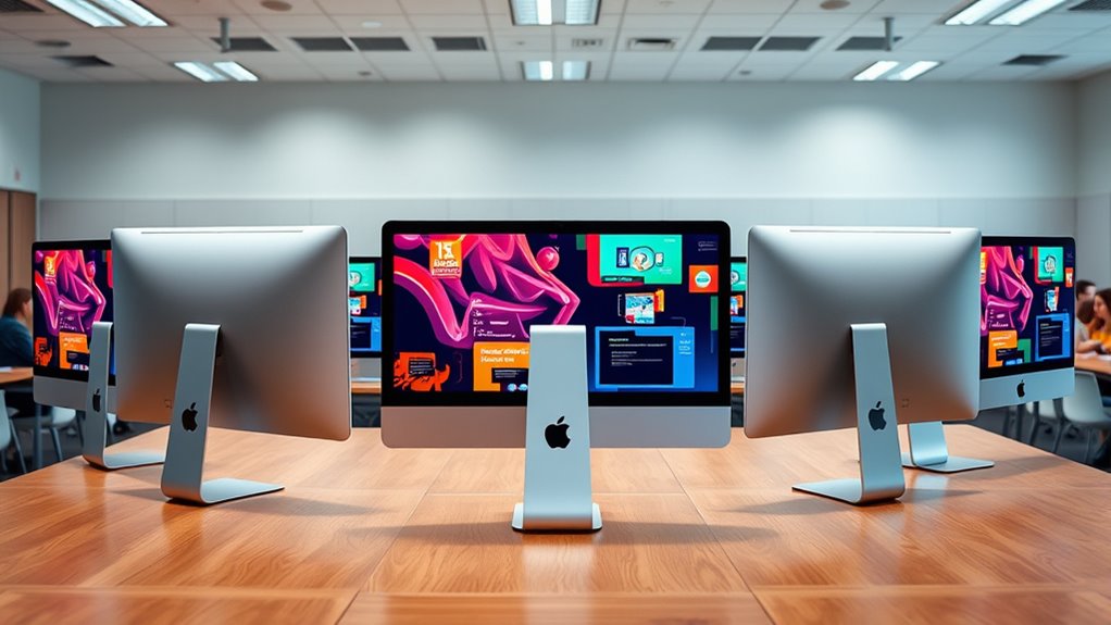 When choosing an iMac for classroom labs, it’s important to guarantee that the device can handle the software required for various activities. I look for models that support the latest operating systems and educational tools, ensuring compatibility with productivity suites and specialized programs. Hardware specifications like processor speed, memory, and graphics are critical for smooth performance, especially with resource-intensive applications. I also verify compatibility with external peripherals such as printers, scanners, and interactive displays, which may need specific drivers or software updates. Given the shift to Apple Silicon chips like the M4, I prioritize models optimized for these processors to ensure stability and efficiency. Ultimately, I consider the availability of software updates and support to keep the system functional and compatible with future educational tools.