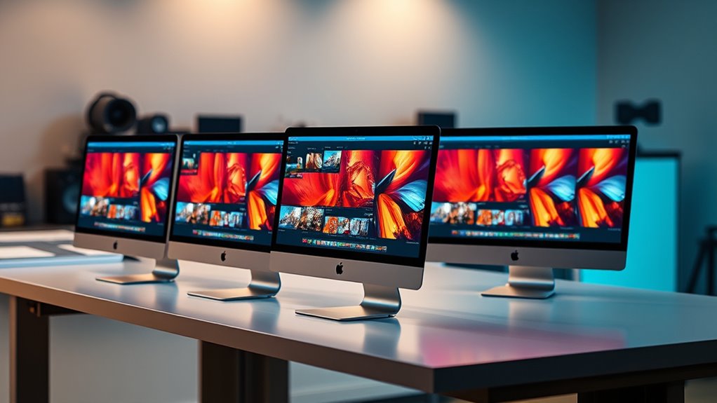 If you’re looking for the best iMacs for video editing in 2025, I recommend models with powerful M4 chips, high-resolution Retina displays, and ample RAM. These iMacs handle demanding editing tasks, color grading, and multitasking smoothly. Features like wide color gamut, high brightness, and fast storage options are essential. For a detailed guide on the top six options, including their specs and how to choose the right one, keep exploring.