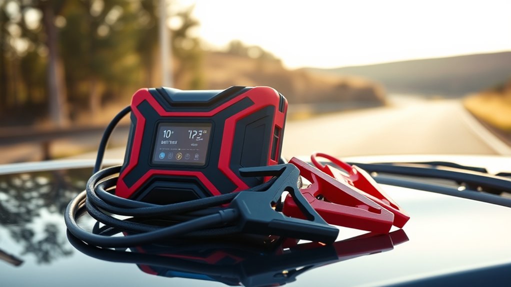 Choosing a durable, weather-resistant jump starter is vital for reliable performance in all conditions. Look for models with an IP65 rating or higher to guarantee protection against water, dust, and impacts in harsh environments. Durable materials like rubberized over-molding or reinforced casings help extend the lifespan and withstand rough handling or accidental drops. Weather resistance is essential—select devices that operate reliably between -4°F and 140°F, making them suitable for any season. Sealed connectors and spark-proof clamps prevent moisture or corrosion damage, maintaining safety and effectiveness over time. Reinforced housings and shock-absorbing features further protect internal components from impacts and vibrations, especially during outdoor or off-road adventures. Prioritizing these qualities ensures your jump starter performs when you need it most.