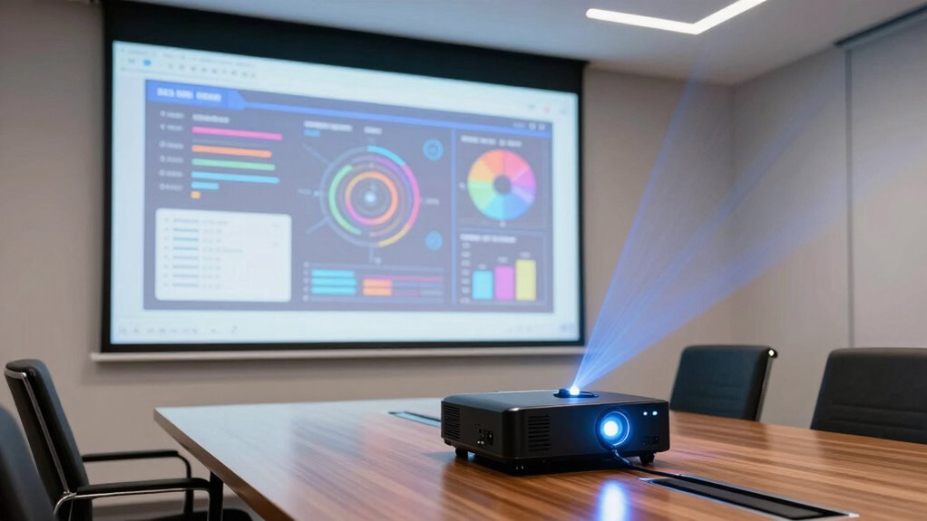 Ever wondered how to guarantee your office projector remains reliable over time? Laser projectors are known for their impressive lifespan, often reaching up to 30,000 hours, far surpassing traditional lamp-based models. This extended durability means fewer bulb replacements, saving money and reducing downtime. They’re also more resistant to dust and vibrations, making them perfect for various office environments. The robust construction ensures consistent performance, even with frequent use. Plus, advanced cooling systems prevent overheating, further enhancing longevity. When choosing a laser projector, durability and longevity should be top priorities, as they assure your investment continues to deliver reliable, high-quality presentations day after day. In the long run, these features minimize interruptions and keep your office running smoothly.