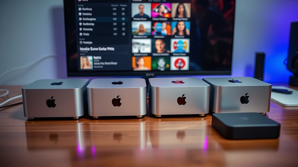 If you’re looking for the best Mac mini models for a media server in 2025, I recommend the Apple M4 and M4 Pro versions, as they offer excellent performance with up to 64GB of RAM and high-resolution display support. The compact size, efficient cooling, and seamless Apple ecosystem integration make them perfect for media streaming and multitasking. To find out which model suits your setup best, keep exploring the options below.