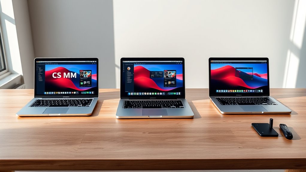MacBook Pros aren’t really upgradable or customizable after purchase, so I recommend choosing a model with the specs you need now, plus some room for future work. Focus on models with the latest M-series chips, ample RAM, and fast storage. If you want to future-proof, consider external GPU options or accessories that enhance your workflow. Planning ahead helps guarantee your setup stays relevant for upcoming 3D projects.