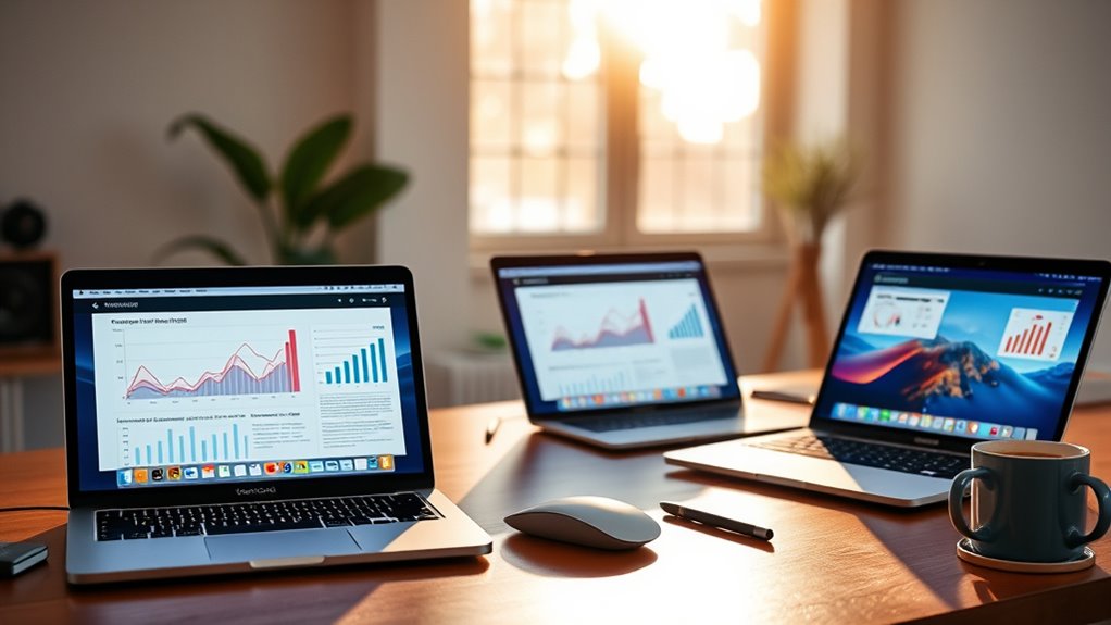 Since seamless integration across devices can greatly enhance your productivity, it’s vital to think about how well a MacBook Pro fits into the Apple ecosystem. Compatibility within this ecosystem allows for effortless connection with my iPhone, iPad, and Apple Watch, making multitasking and data sharing smoother. Features like iPhone Mirroring, Messages, and FaceTime work seamlessly across MacBook Pro models, enabling quick communication and collaboration. Using macOS grants me access to exclusive services like iCloud, Continuity, Handoff, and Universal Clipboard, which streamline my workflow. Additionally, the ecosystem supports third-party apps like Microsoft 365 and Adobe Creative Cloud, optimized for macOS. Security is also a priority, with Touch ID and Apple’s encryption protecting sensitive academic and professional data, giving me peace of mind.