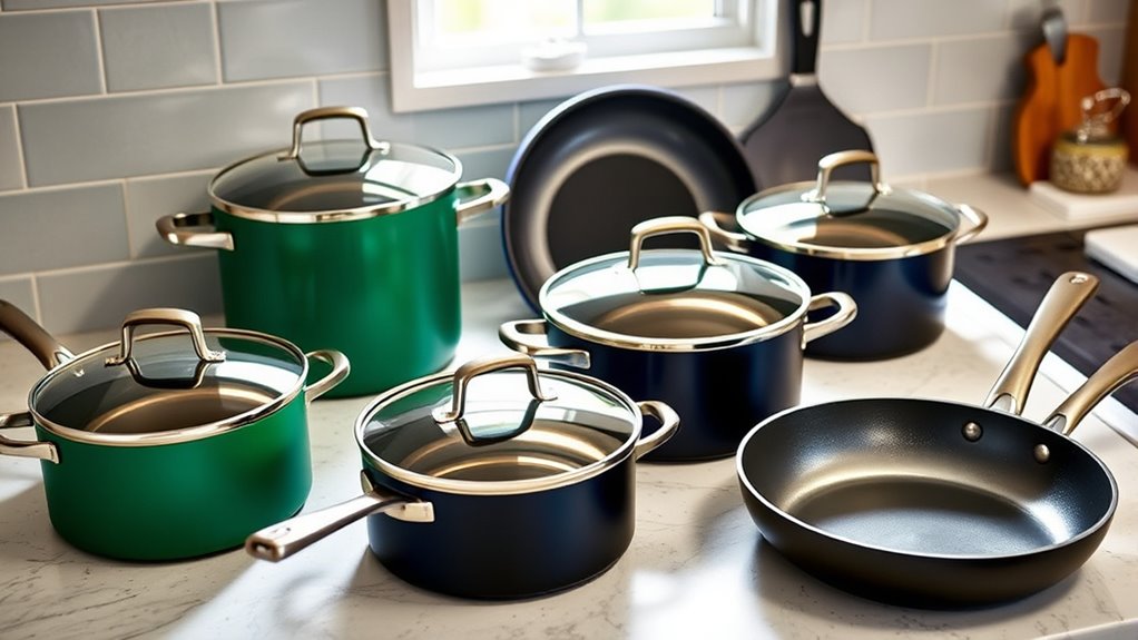 Choosing a PFOA-free nonstick cookware set is like selecting a trusted partner in your kitchen journey—safe, reliable, and ready to support your culinary adventures. Imagine each piece as a sturdy bridge, guiding your meals from raw ingredients to delicious plates without harmful toxins. When you prioritize safety and performance, you’re creating a healthier home and a more joyful cooking experience. So, pick wisely and let your kitchen be a sanctuary of both flavor and peace of mind.