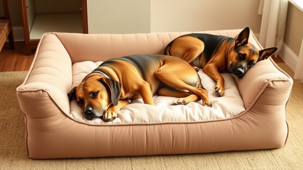 Since large breed dogs can be quite active or even senior, guaranteeing their orthopedic bed stays in place is vital for safety and comfort. A non-slip bottom with rubberized or textured surfaces prevents the bed from sliding on smooth floors like hardwood or tile. This feature is especially essential for active dogs who jump in and out or seniors who may be unsteady. Durable materials such as silicone dots or anti-skid pads on the underside enhance grip and reduce shifting risks. A well-designed non-slip base keeps the bed securely in place, supporting safe, restful sleep. Pairing these features with a lightweight, stable structure ensures the bed remains steady despite frequent movement or jumping, offering peace of mind and added safety for your large dog.