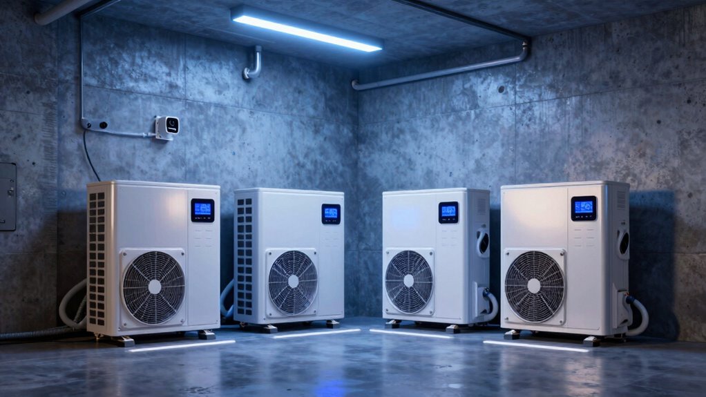 Energy efficiency plays a vital role in keeping mining room operations cost-effective and environmentally friendly. When choosing a portable air conditioner, look for high EER or SEER ratings to guarantee lower energy consumption. Units that use environmentally friendly refrigerants like R-32 or CFC-free options tend to operate more efficiently and reduce environmental impact. Features like programmable timers and eco-mode settings help optimize energy use by turning off during low-need periods. Advanced compressor technology and variable speed fans adjust output based on cooling demands, saving power. Additionally, proper insulation and sealing of the mining room reduce heat gain, decreasing the workload on the AC unit. Prioritizing these factors ensures effective cooling while minimizing energy costs and environmental footprint.