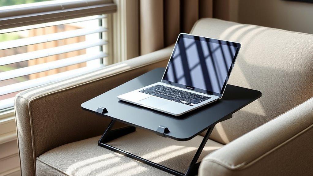 Portability and weight are key factors to contemplate because they directly impact how easily you can carry and set up your lapstand. Lightweight models, usually under 1 pound, are perfect for frequent travelers or outdoor work, as they minimize bulk and fatigue. Heavier stands, exceeding 2 pounds, may offer better stability but can be cumbersome to transport over long distances. Foldable and compact designs markedly improve portability, allowing you to pack your lapstand in bags or backpacks without adding bulk. The overall weight and foldability determine how convenient the stand is for on-the-go use and how comfortable it feels during extended periods of carrying. Balancing lightness with stability is essential to find a portable lapstand that works effortlessly wherever you need it.