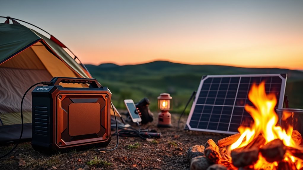 When choosing a portable power station, I found that over 60% of campers prioritize battery capacity and charging options. With so many great options out there, like the Jackery Explorer 300 and Flashfish 200W, it’s clear that reliable power can considerably enhance your outdoor experience. Remember, a well-chosen station not only keeps your devices running but also guarantees you’re prepared for unexpected outages. Stay powered and enjoy your camping adventures to the fullest!