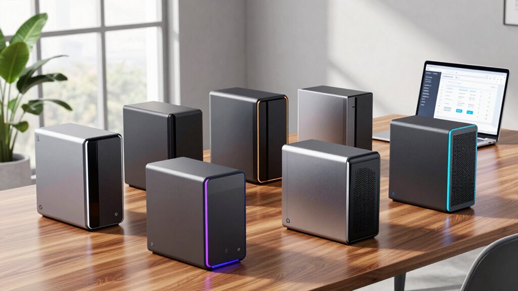 Understanding storage capacity is essential for ensuring your NAS meets your small business needs. When I choose a NAS, I first consider the total storage capacity, which can range from 8TB to over 256TB. This flexibility is critical for varying data demands. I also evaluate the number of drive bays; more bays mean greater options for future expansions. It’s important to understand RAID configurations, as they can impact both performance and redundancy. Finally, I look for systems that support hybrid storage strategies, combining HDDs and SSDs for ideal speed and efficiency. Evaluating the maximum capacity per drive is also key, as it determines overall scalability and how much data I can store on individual drives.