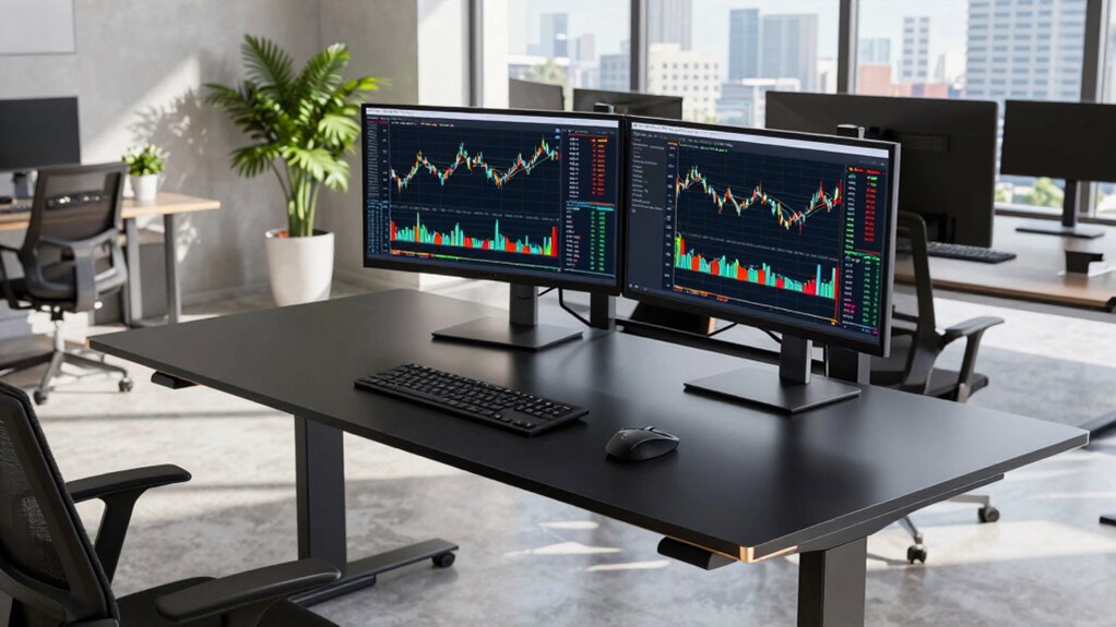 Imagine yourself effortlessly gliding from sitting to standing, your workspace transforming like a chameleon to match your mood. With one of these premium sit-stand desks, you’ll feel the smooth glide of innovation supporting your every move. Whether you’re analyzing charts or sealing deals, these desks promise comfort and style, turning your trading day into a seamless dance between focus and movement. Elevate your workspace—and your success—today.