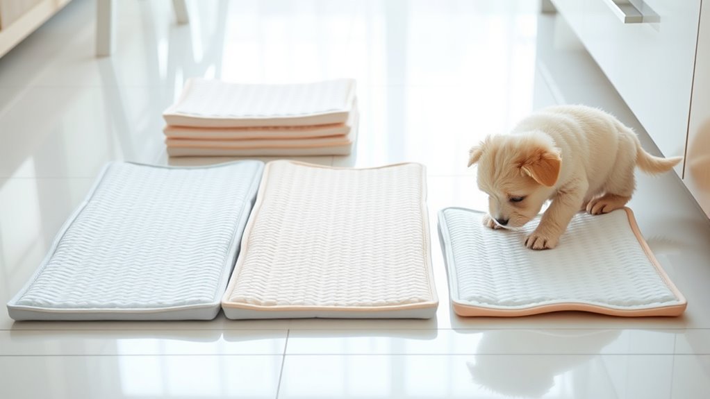 When choosing puppy training pads, considering additional odor controls can make a significant difference in maintaining a fresh indoor environment. Activated carbon layers are highly effective, as they absorb and neutralize odors at the source, preventing lingering smells. Multi-layer designs that incorporate charcoal or odor-neutralizing polymers help keep the area smelling clean. Some pads are infused with pheromones or attractants, encouraging use while minimizing unpleasant scents. Properly sealed edges also help contain odors within the pad, preventing leaks into your home. Regularly changing and disposing of used pads is essential to prevent odor buildup and maintain freshness. By paying attention to these odor control features, you’ll create a more pleasant space for both you and your puppy.