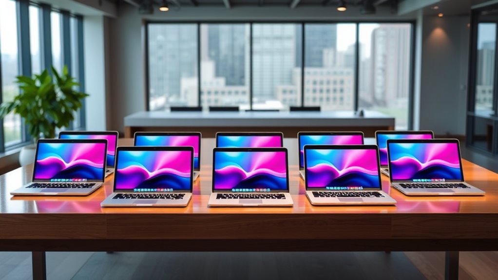 Ever wondered how long a renewed MacBook Air can keep up with your busy day? Most models offer up to 18 hours of battery life on a full charge, making all-day use feasible. I’ve found that refurbished units often maintain high battery health, with many still at 100% capacity. This means you can rely on consistent performance, especially if you choose models with larger batteries or optimized power management. Quick-charging via USB-C adapters is a game-changer, allowing rapid top-ups during breaks. Of course, actual battery life depends on your activities—streaming, browsing, or running demanding apps will affect longevity. Overall, selecting the right model ensures you get the most out of your MacBook Air’s impressive battery life, supporting your productivity without frequent recharges.