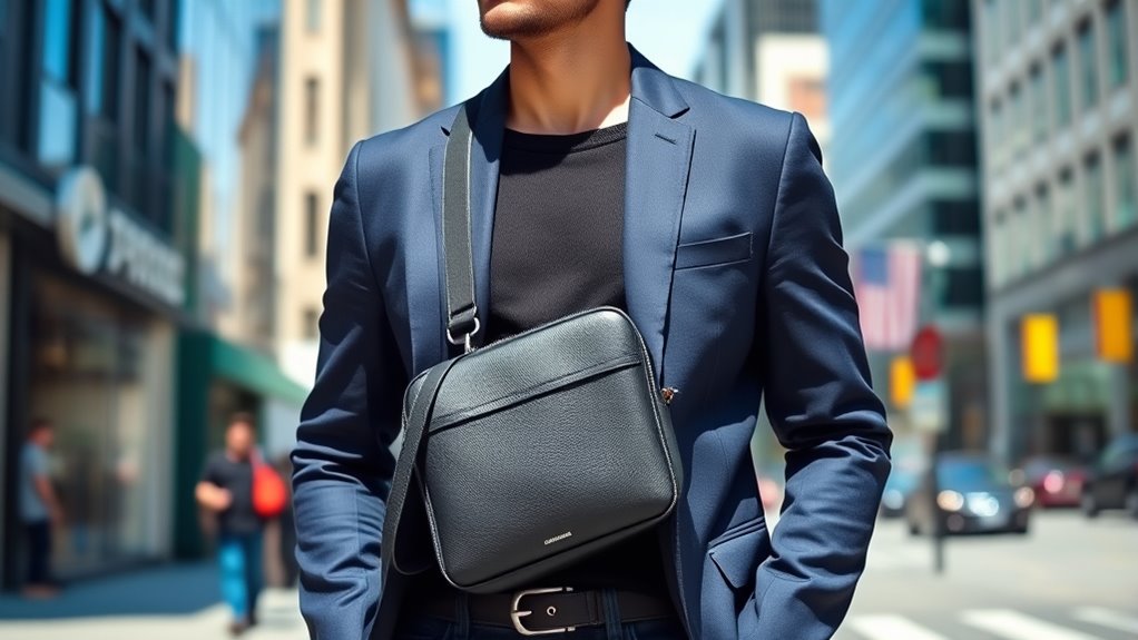 Security features are essential to contemplate when picking a crossbody sling bag for men, especially if I plan to use it in crowded or high-theft areas. I look for bags with lockable zippers and hidden compartments, which help prevent pickpocketing and unauthorized access. RFID blocking technology is a smart addition, safeguarding my credit cards, passports, and IDs from electronic scanning. Secure closure mechanisms like buckles, magnetic snaps, or combination locks add an extra layer of safety. Anti-theft pockets, strategically placed and discreet, make it easier to keep my valuables out of sight. Secure straps and concealed pockets are also vital in high-risk environments. These features give me peace of mind, knowing my belongings are protected without sacrificing style or convenience.