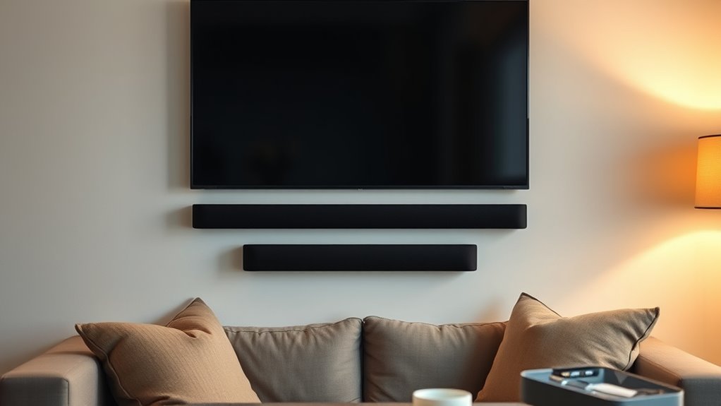 When choosing a soundbar for a small room, its design and appearance matter just as much as sound quality. A sleek, minimalistic style helps the device blend seamlessly with your decor, avoiding visual clutter. Compact dimensions, ideally under 18 inches, prevent the soundbar from overwhelming the space. Wall-mountable options are great for saving surface area and maintaining a clean look. The finish—whether matte black or gloss—can enhance integration with your furniture and electronics. Additionally, consider LED indicators and remote controls that don’t clash with your room’s style or become distractions. Overall, selecting a visually appealing and unobtrusive soundbar guarantees it complements your small space without sacrificing aesthetics or functionality.