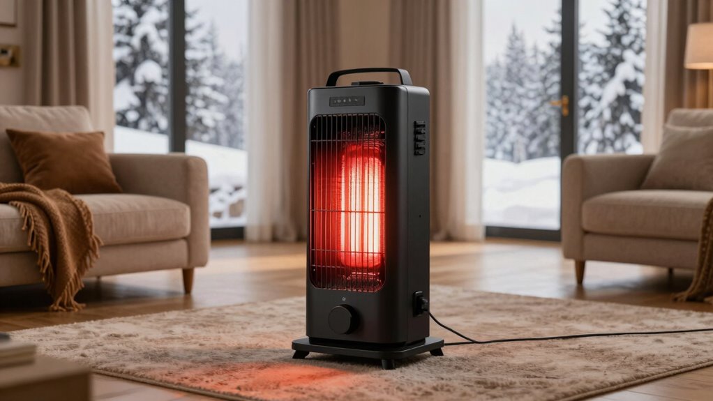 These space heaters include essential safety features like tip-over switches, which automatically turn off the heater if it tips over, and overheat protection that shuts the unit down if it gets too hot. Many also have cool-touch exteriors to prevent burns and secure grilles to keep fingers safe. I always look for these features to make certain of safe, cozy warmth without worry.