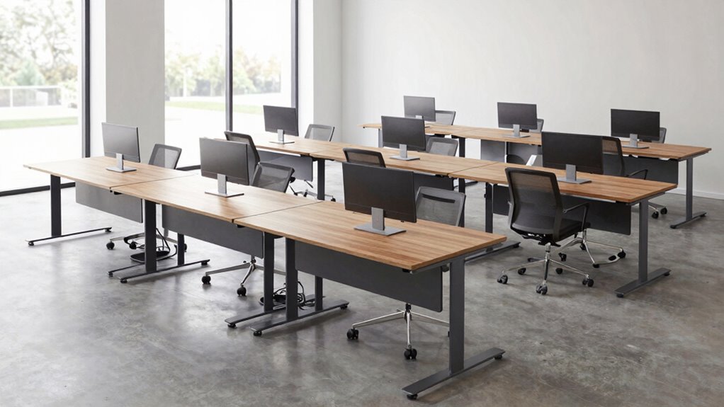 When considering a standing desk with a cable tray, ease of assembly is a crucial factor that can save you time and frustration. I look for desks with tool-free setup options like clamp-on or adhesive-based attachments, which make installation quick and straightforward. Clear instructions or visual guides for attaching the cable tray are a huge plus, helping me avoid guesswork. I also check the number of parts and overall complexity; ideally, I want to assemble everything within an hour. Pre-drilled holes or modular components that simplify attaching the tray are big advantages, ensuring a secure fit without hassle. Additionally, detailed assembly videos or reliable customer support can make the process even smoother if I run into challenges. This focus helps me get my workspace ready with minimal stress.
