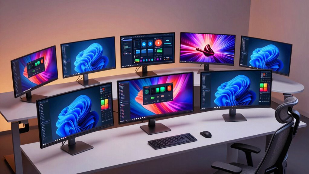 Built-in features and software tools considerably enhance productivity by making multitasking and customization straightforward on super ultrawide monitors. Features like Picture-in-Picture (PiP) and Picture-by-Picture (PbP) let me view multiple input sources simultaneously, streamlining workflows. Software tools such as on-screen control panels or dedicated apps make adjusting display layouts, split-screen configurations, and color settings quick and easy. HDR support and color accuracy features improve visual clarity, reducing eye strain during long work sessions. Integrated blue light reduction, flicker-free technology, and eye-care modes help prevent fatigue. Additionally, ergonomic software allows me to tweak brightness, contrast, and display warmth for a personalized, comfortable viewing experience. These built-in tools directly contribute to a more efficient and comfortable workspace.