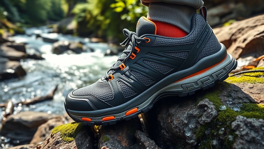 To navigate challenging trails safely, I prioritize shoes with a rubber outsole featuring deep, multidirectional lugs that grip uneven and slippery surfaces effectively. These lugs dig into dirt, mud, and loose gravel, providing reliable traction. A well-designed tread pattern that sheds mud and debris keeps the grip consistent in wet or muddy conditions. I also look for shoes with sticky rubber compounds, which improve adherence on slick surfaces like wet rocks, roots, or ice. Proper traction is essential to prevent slips and falls, especially during water crossings or steep ascents and descents. Ideally, the tread balances grip with stability, offering secure footing without sacrificing maneuverability, so I can maintain confidence and control on any trail.