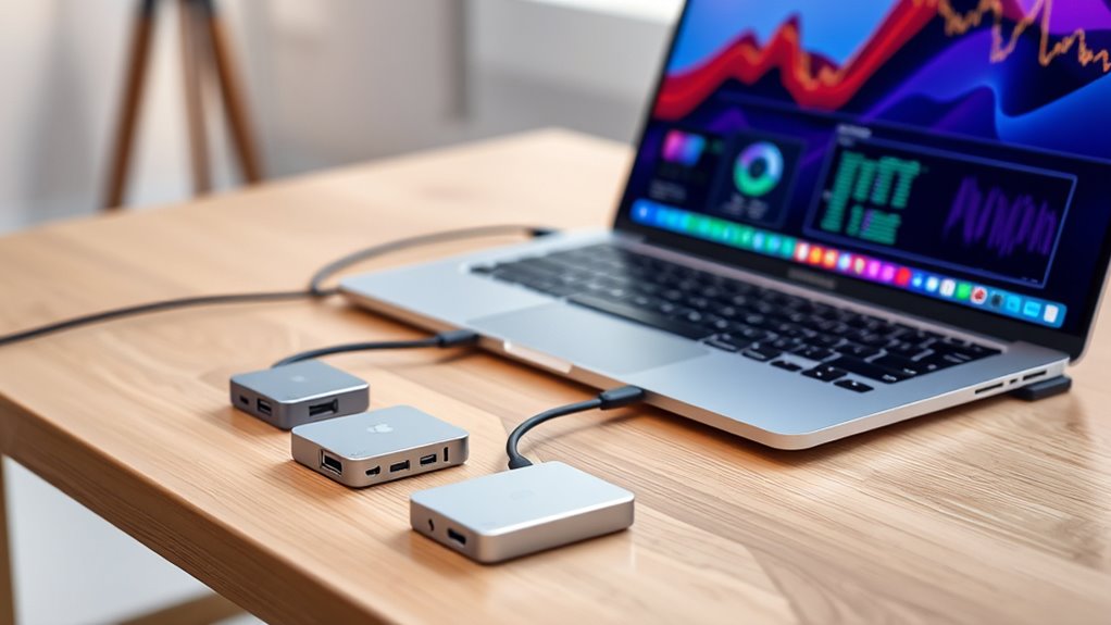 In summary, selecting the appropriate USB-C hub can truly transform your MacBook experience—think of it as your trusty sidekick in a modern-day quest for productivity. With so many top options like Anker, Hiearcool, and UGREEN, you’ll find the perfect fit for your needs. Don’t forget to take into account ports, power delivery, and compatibility. After all, even in 2025, a good hub remains your secret weapon—like a Swiss Army knife for your tech arsenal.