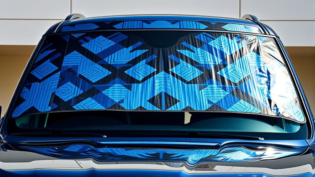 The effectiveness of heat reduction in windshield sun shades depends heavily on their design and material choices. High-performance shades can block up to 99% of UV rays, drastically lowering interior temperatures. Shades with reflective coatings like silver or aluminum foil excel at bouncing sunlight away, reducing heat transfer inside your vehicle. Design features such as overlapping panels and full coverage eliminate gaps, preventing heat and sunlight from slipping through. Multi-layered materials, combining bubble insulation and reflective surfaces, can cut interior temperatures by up to 90°F, making a significant difference on hot days. Proper fit is essential—shades that snugly cover the windshield maximize heat rejection and avoid allowing heat to seep in through edges. When choosing a shade, prioritize these factors for ideal cooling efficiency.